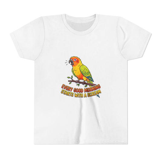 Youth Tee — Colorful Sun Conure Parrot "Every Good Morning Starts With A Scream" Kids Shirt