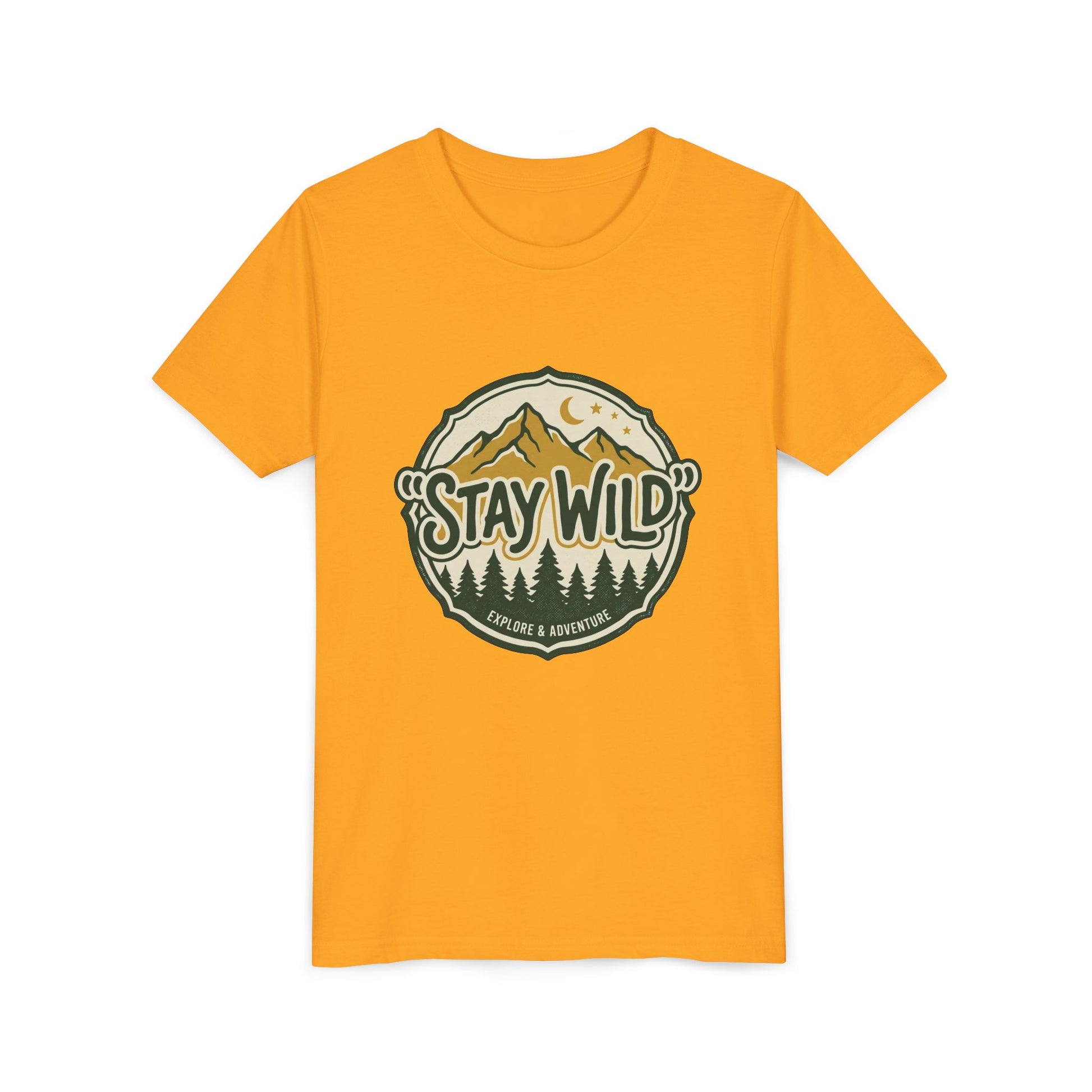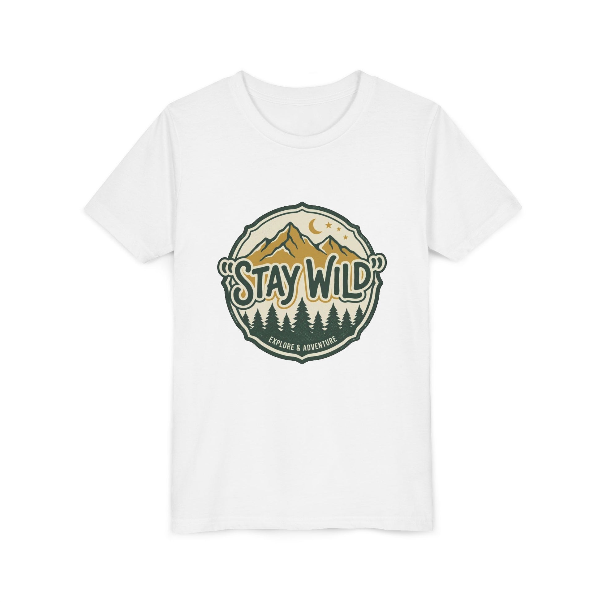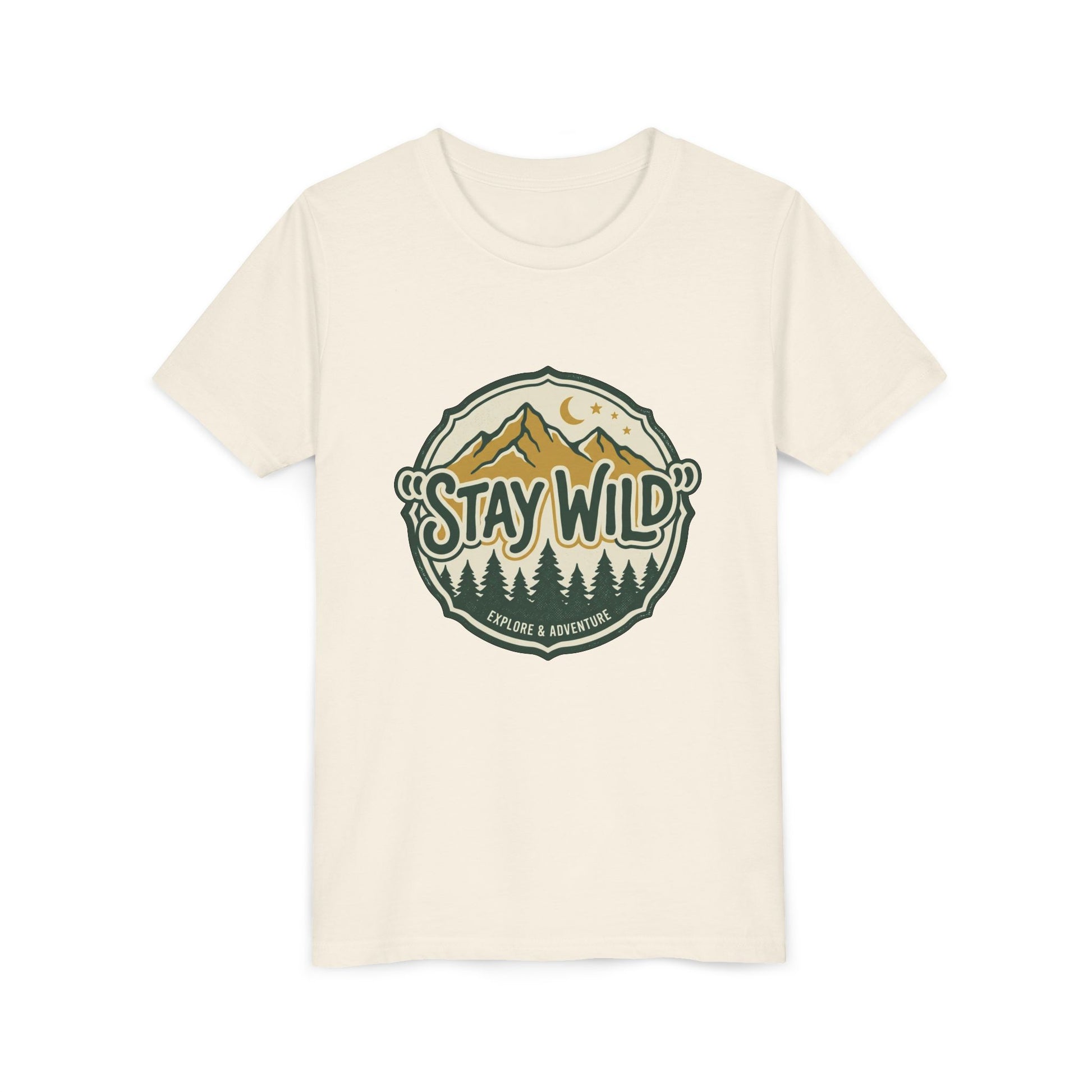 Soft, lightweight, and adventure-ready — this youth tee brings the outdoors close to home. A vintage-style badge sits at the chest: pine silhouettes, sunlit peaks, and a crescent moon framing the hand-lettered phrase “Stay Wild.” It’s quiet confidence for kids who love trail-side snacks, sticky marshmallows, and exploring backyard creeks. The retail fit and crew neckline keep movement easy while the airy cotton feels gentle against young skin. Let them wear a small reminder to roam, discover, and come back with pockets full of stories.